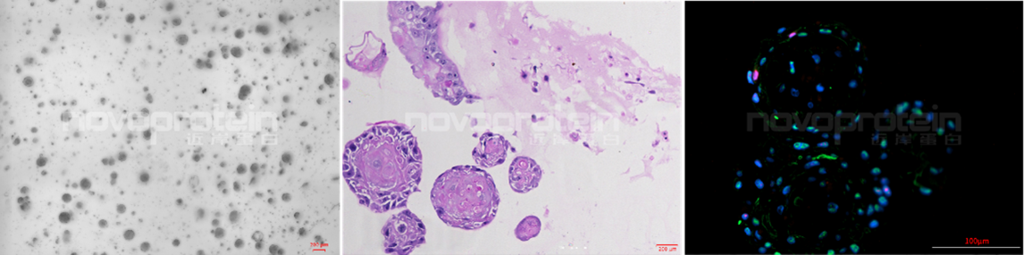 Figure 1. Human breast cancer organoids were cultured with Novoprotein cytokines and growth factors as specified in the table. These organoids showed good morphology. Fluorescent image of human breast cancer organoid structure. DAPI (blue), Ki67 (red), and ER (green) were well conserved in these derived organoids.