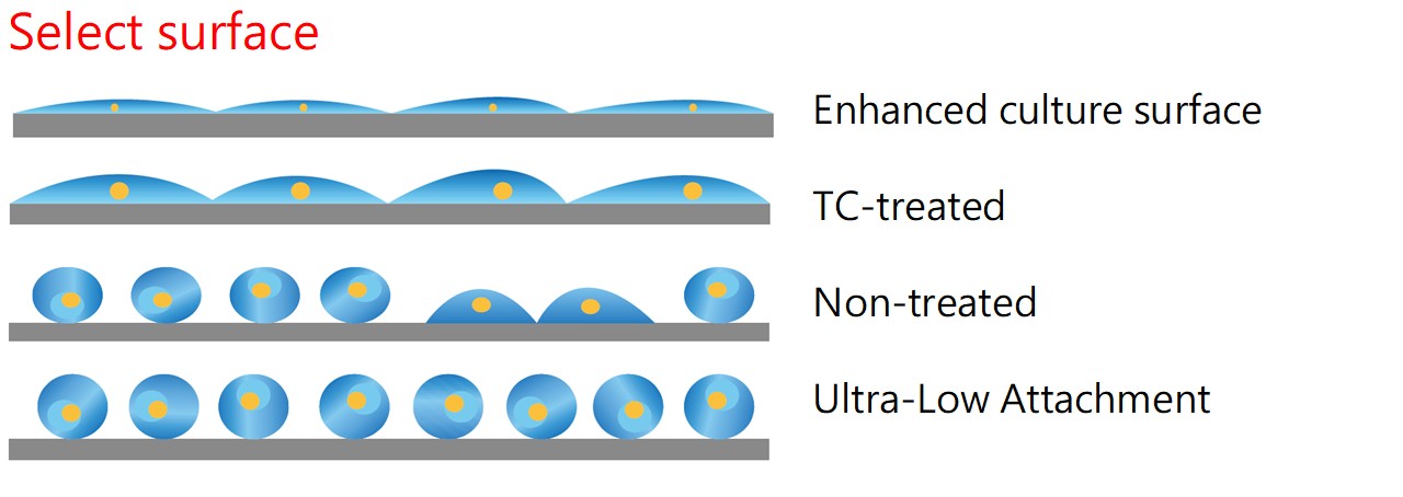 | Cell Type/Surface Type | Ultra-Low Attachment | Non-treated | TC-treated | Enhanced culture surface | |